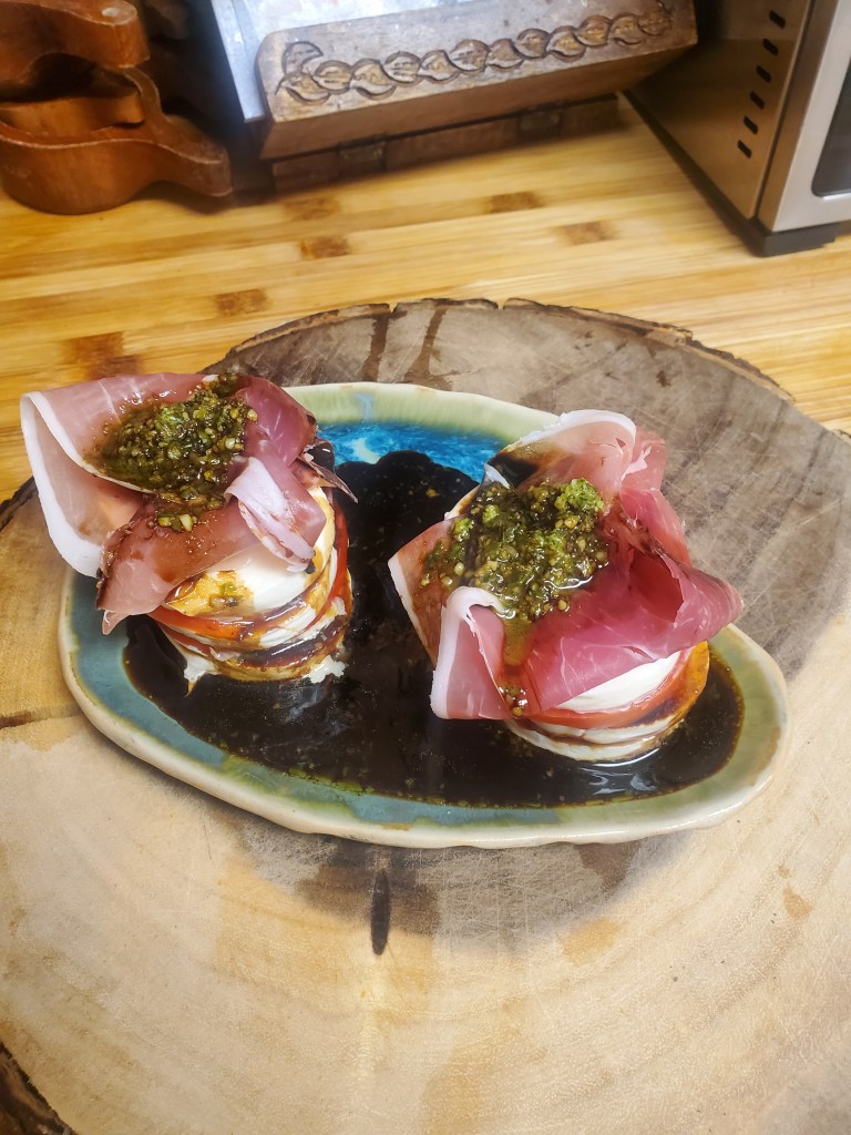 Caprese is usually the taste of summer: tomatoes, mozzarella, basil. But I wanted something a little deeper, a little richer, the kind of meal that speaks not just of freshness but of longing. So instead of basil, I spooned on a bright green pesto, fragrant and nutty. Instead of simplicity, I added prosciutto, thin slices of salt and tenderness that clung to the tomatoes and cheese. Finally, I drizzled it all with black Mission fig balsamic vinegar, dark and sweet, carrying that balance of sharpness and syrup that lingers.